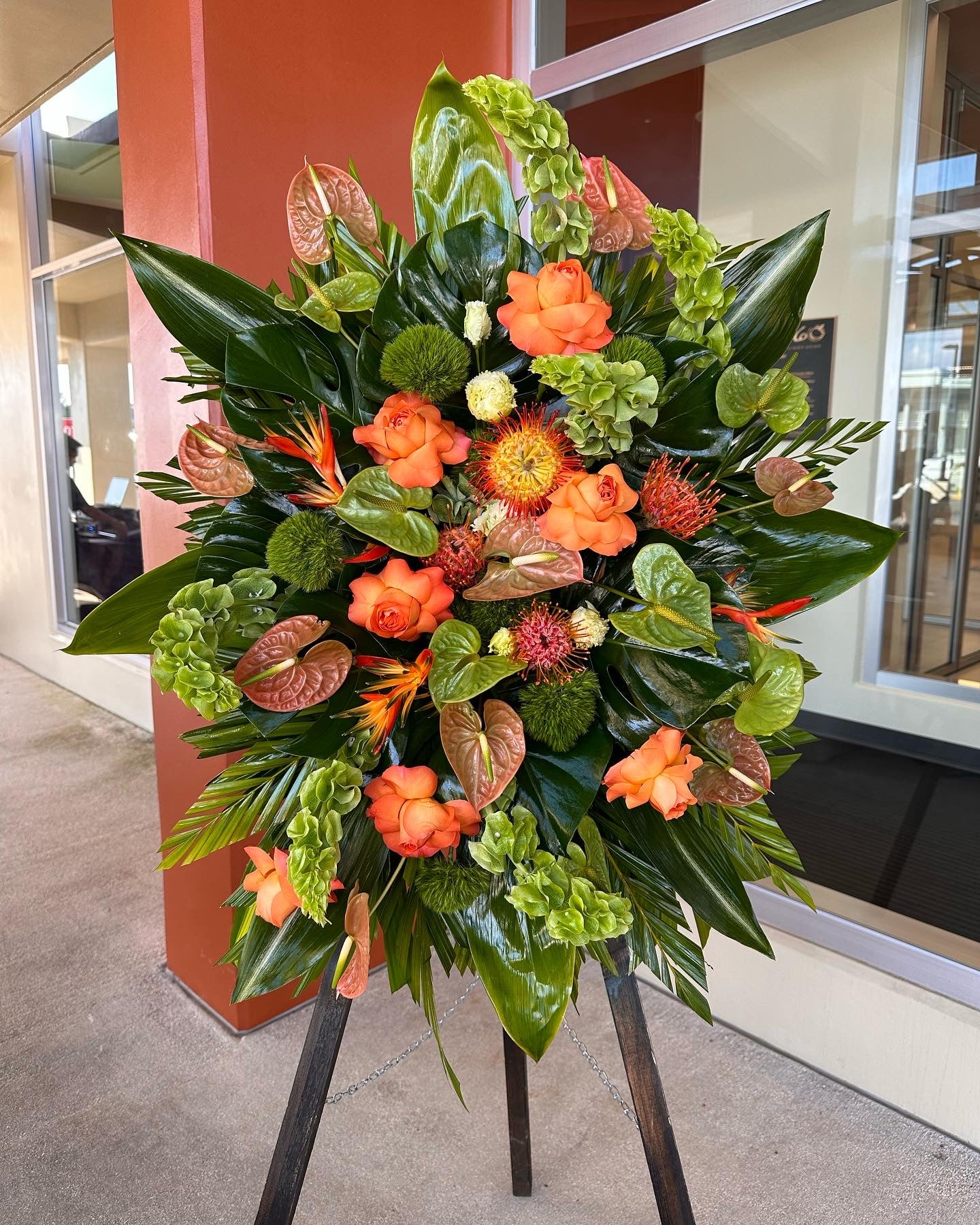 Emerald green and burnt orange blooms come together in this striking standing spray, perfect to commemorate an event, celebrate a moment or honor a loved one.